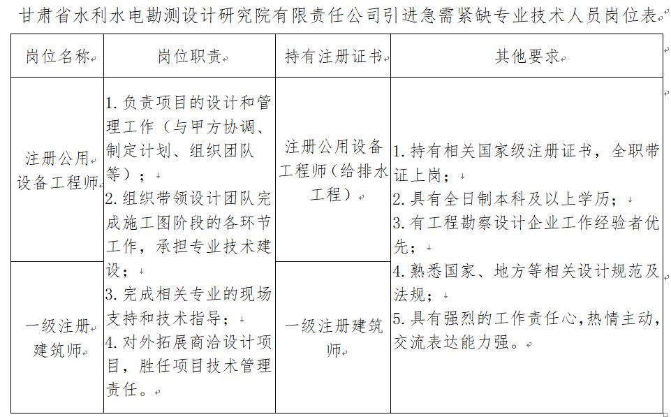 本次引進(jìn)的具體崗位及資格條件詳見《甘肅省水利水電勘測設(shè)計研究院有限責(zé)任公司引進(jìn)急需緊缺專業(yè)技術(shù)人員崗位表》(附件1)。