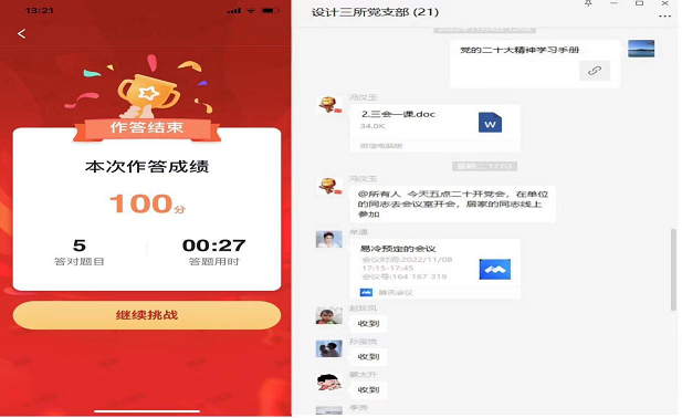 以賽促學(xué),強技礪能精研細(xì)琢。各黨支部組織黨員通過學(xué)習(xí)強國“黨的二十大精神答題活動”“黨的二十大精神應(yīng)知應(yīng)會百題”等形式,開展線上答題競賽,全面檢驗黨員干部對黨的二十大報告內(nèi)容的掌握程度,進(jìn)一步增強黨員干部對學(xué)習(xí)黨的二十大精神的認(rèn)識和重視,推動黨的二十大精神入腦入心,鞏固提升學(xué)習(xí)效果,以賽促學(xué)、以知促行,用黨的二十大精神武裝頭腦、指導(dǎo)實踐、推動工作。