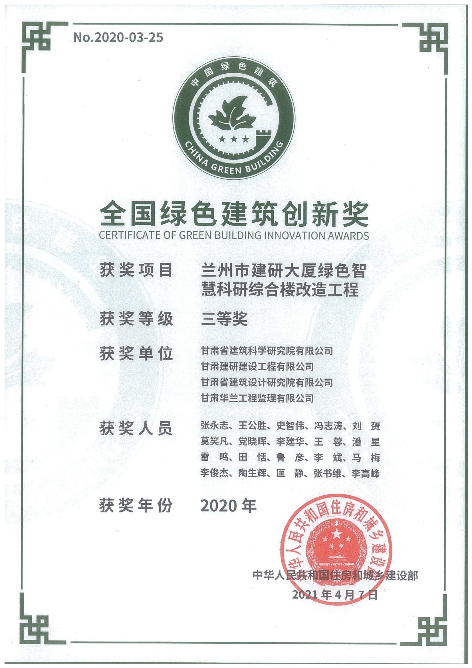 全國(guó)綠色建筑創(chuàng)新獎(jiǎng)(蘭州市建研大廈綠色智慧科研綜合樓改造工程)