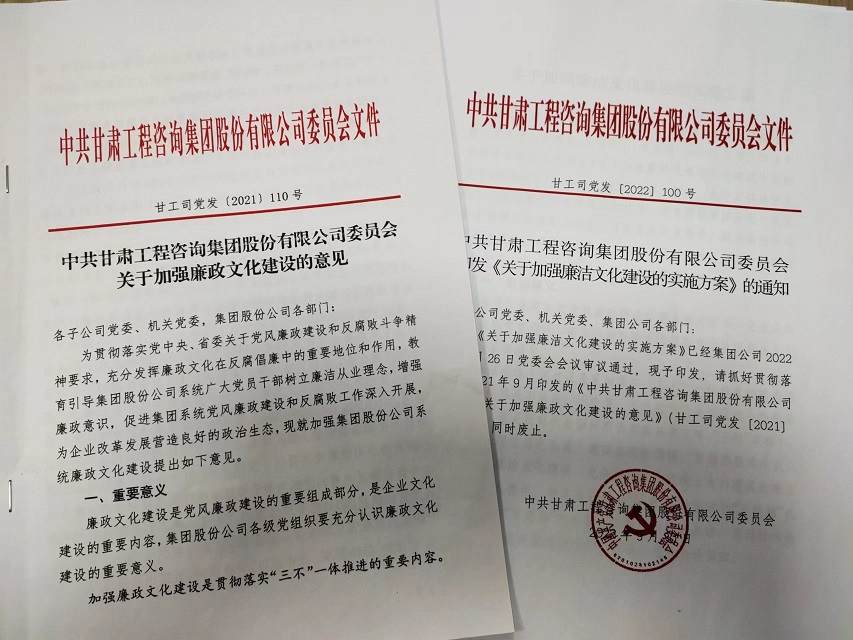 作為新組建的產(chǎn)業(yè)集團(tuán),甘肅工程咨詢集團(tuán)把資產(chǎn)整合、產(chǎn)業(yè)耦合和文化融合作為集團(tuán)公司組建的重要內(nèi)容,其中讓廉潔文化建設(shè)在企業(yè)文化建設(shè)中先行一步,早安排早部署,2021年9月集團(tuán)公司黨委研究印發(fā)《關(guān)于加強(qiáng)廉政文化建設(shè)的意見(jiàn)》,在中共中央辦公廳《關(guān)于加強(qiáng)新時(shí)代廉潔文化建設(shè)的意見(jiàn)》和省委《實(shí)施方案》印發(fā)后,又及時(shí)對(duì)標(biāo)、查缺補(bǔ)漏,2022年9月修訂印發(fā)《關(guān)于加強(qiáng)廉潔文化建設(shè)的實(shí)施方案》,為新時(shí)代集團(tuán)公司加強(qiáng)廉潔文化建設(shè)提供了指導(dǎo)。自組建以來(lái),集團(tuán)公司廉潔文化建設(shè)力求在“內(nèi)化于心”上下功夫,在“外化于行”上求實(shí)效,引導(dǎo)干部職工廉潔從業(yè),廉潔用權(quán),積極營(yíng)造“崇廉、尚廉、倡廉、守廉”的企業(yè)風(fēng)尚和發(fā)展氛圍。