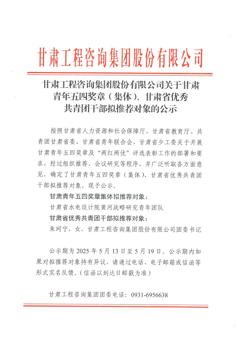 甘肅工程咨詢集團(tuán)股份有限公司關(guān)于甘肅青年五四獎(jiǎng)?wù)拢w)、甘肅省優(yōu)秀共青團(tuán)干部擬推薦對(duì)象的公示