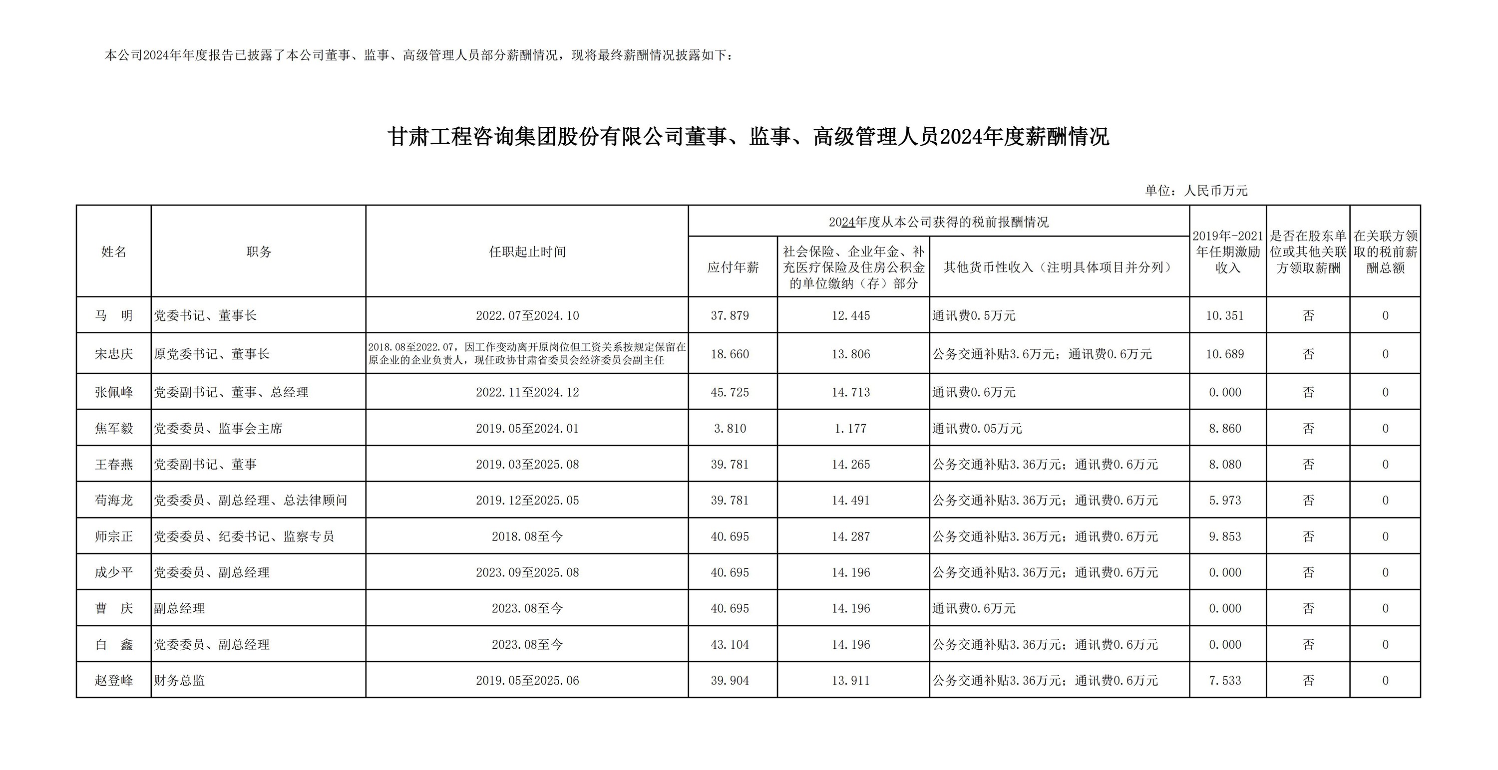甘肅工程咨詢集團股份有限公司董事、監(jiān)事、高級管理人員2024年度薪酬情況及甘肅工程咨詢集團股份有限公司工資分配情況