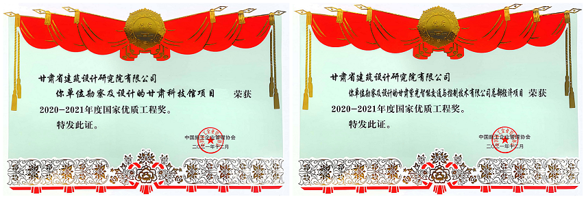 日前,從中國施工企業(yè)管理協(xié)會(huì)傳來喜訊,由甘肅省建筑設(shè)計(jì)研究院有限公司勘察及設(shè)計(jì)的“甘肅科技館項(xiàng)目”和“甘肅紫光智能交通與控制技術(shù)有限公司總部經(jīng)濟(jì)項(xiàng)目”榮獲2020—2021年度國家優(yōu)質(zhì)工程獎(jiǎng)。