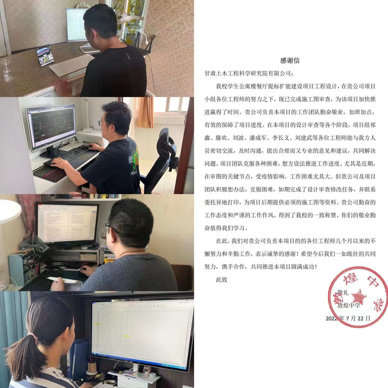 設(shè)計一所堅決貫徹土木工程院黨委要求,第一時間部署疫情防控工作。在部門職工居家辦公期間,積極與軟件公司溝通協(xié)調(diào),為所有設(shè)計軟件增加了在線使用版,并利用釘釘、微信進行線上溝通,疫情期間完成了2022年華亭市安口鎮(zhèn)老舊小區(qū)住宅樓棚戶區(qū)改造項目施工圖審查、甘肅武威工業(yè)園區(qū)天馬資源開發(fā)有限公司鋼結(jié)構(gòu)標準化廠房建設(shè)項目、敦煌中學(xué)學(xué)生公寓樓餐廳提標擴能建設(shè)等項目,得到建設(shè)單位的一致好評和致信感謝,極大提升了部門員工技術(shù)創(chuàng)新、全方位服務(wù)的工作熱情。