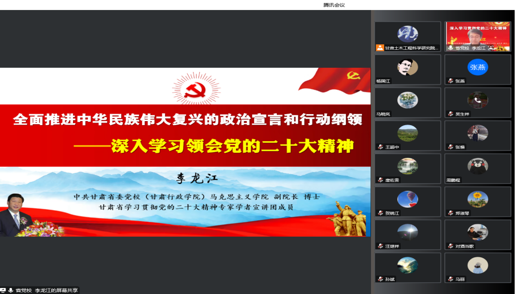 12月14日,甘肅土木工程科學研究院有限公司以視頻會議形式召開黨委理論學習中心組學習(擴大)會議暨黨的二十大精神專題培訓輔導講座。黨委副書記、監(jiān)事會主席、工會主席張磊主持會議,領(lǐng)導班子成員、全體黨員、中層干部、入黨積極分子參加。