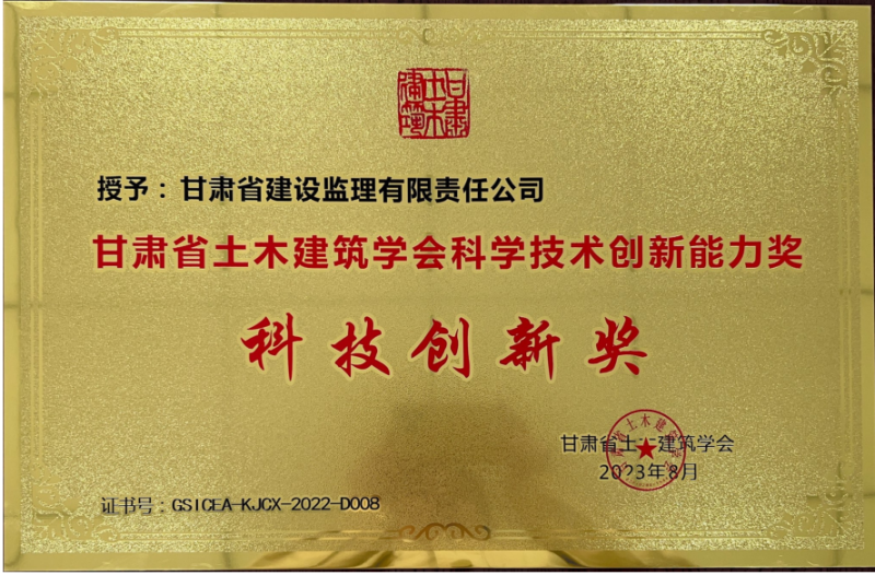 近日,省建設(shè)監(jiān)理公司榮獲“甘肅省土木建筑學(xué)會科技創(chuàng)新獎”。此獎項充分肯定了公司核心技術(shù)能力,彰顯了公司的品牌實(shí)力和行業(yè)影響力。