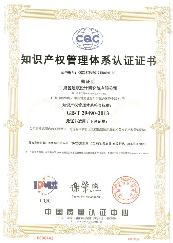 近日,省建筑設計院收到由中國質量認證中心頒發(fā)的編號為CQC23IPMS0171ROM/6100的《知識產權管理體系認證證書》,標志著省建筑設計院知識產權管理體系完全符合GB/T 29490-2013標準,這是省建筑設計院在國家層面知識產權領域取得的重要認可,進一步提升了省建筑設計院的綜合競爭力。