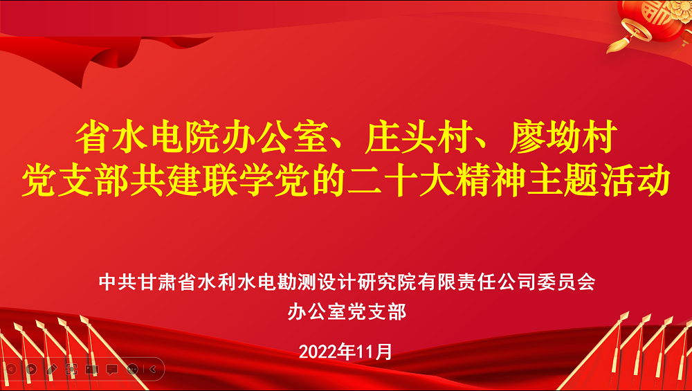 為持續(xù)促進(jìn)黨的二十大精神學(xué)習(xí)貫徹走深走實(shí),使黨的二十大精神進(jìn)村入戶、深入人心,11月22日,甘肅省水利水電勘測設(shè)計(jì)研究院有限責(zé)任公司辦公室黨支部與幫扶村西峰區(qū)莊頭村黨支部、廖坳村黨支部開展共建聯(lián)學(xué)黨的二十大精神主題活動(dòng)。